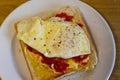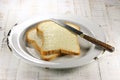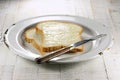 Single slice of buttered white bread ready to make a snack or sandwich on a white background with copyspace, overhead view
