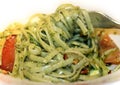 Photo of beige, orange and green fettuccini on wooden table. Daylight