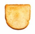 Slice of hot fruity toast with raisins and a dollop of melting butter on top on a white background, high angle view