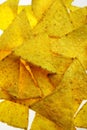 Bowl of traditional triangular corn tortilla chips or nachos for a delicious dipping snack or appetizer in a close up view
