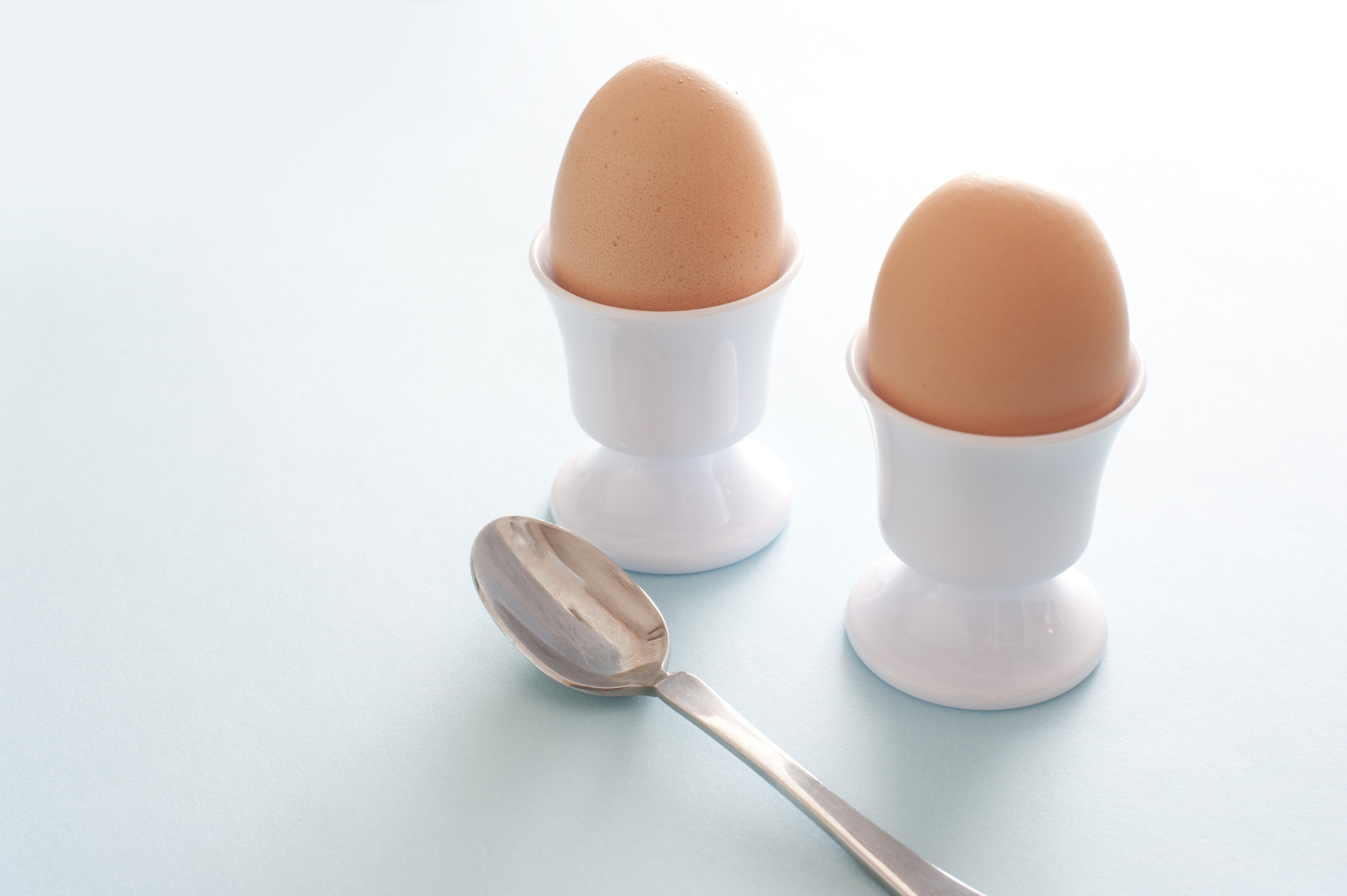 Two fresh boiled eggs for breakfast served in white ceramic egg cups with a spoon over blue with copy space
