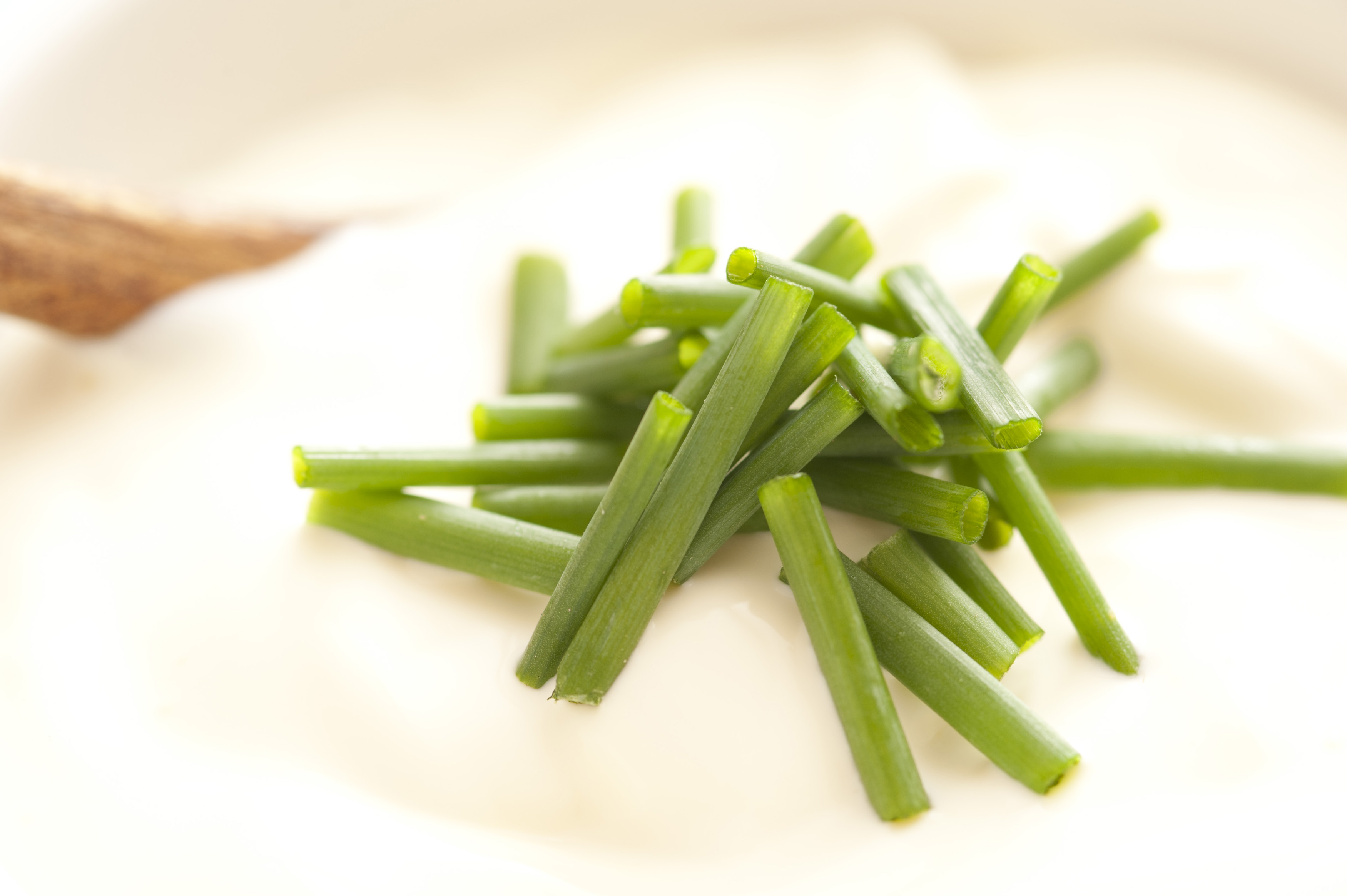 Chopped fresh green chives used as a garnish on a bowl of sour cream in a close up view on the herbs