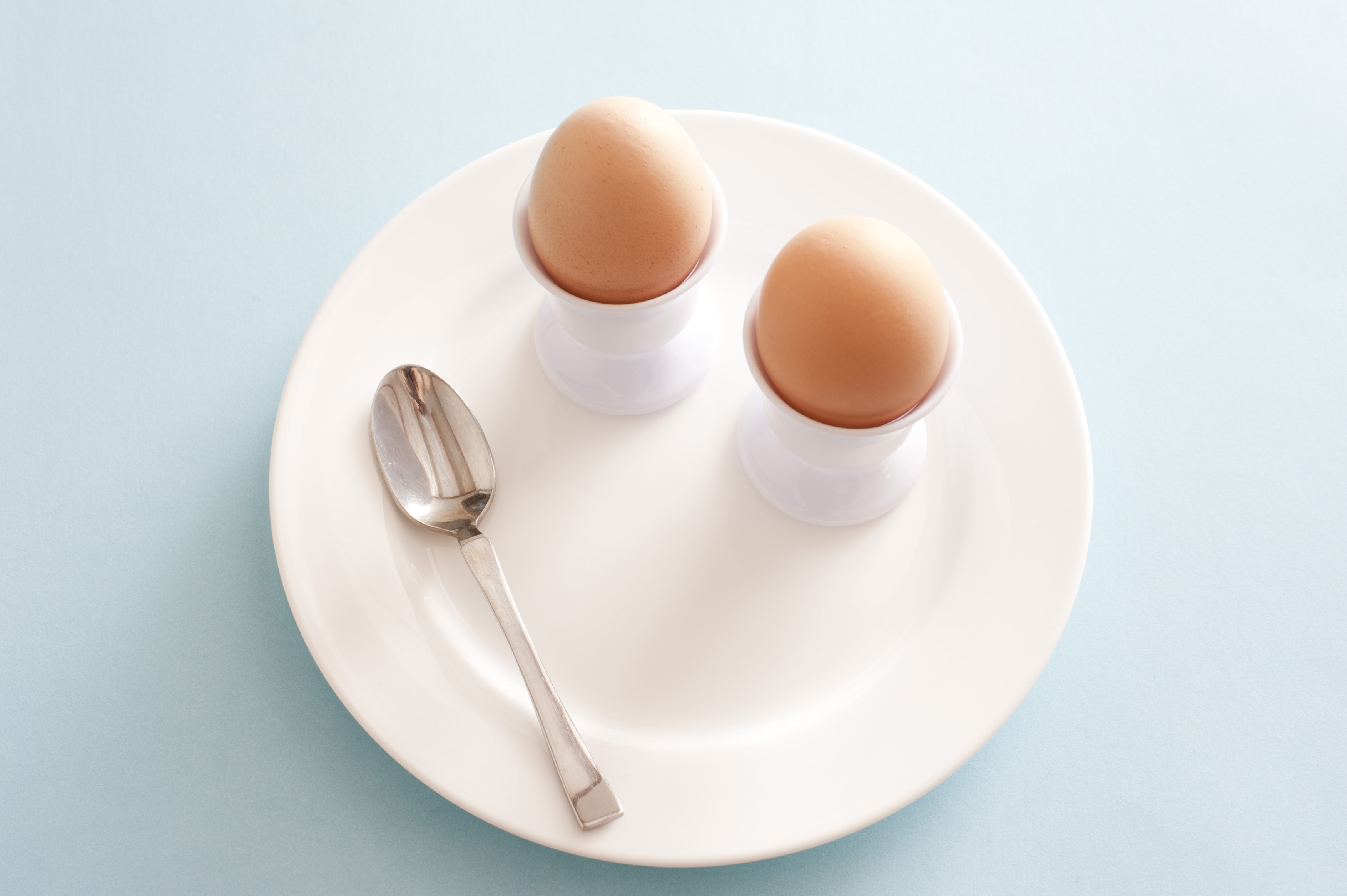 Two boiled fresh brown farm eggs for a healthy breakfast served on a white plate in eggcups in a high angle view