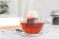 Brewing tea in a glass mug with a teabag steeping in boiling water for a refreshing drink, close up with copyspace