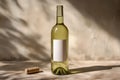 Open unlabelled white wine bottle with two full glasses of wine on a slatted wooden table with copyspace