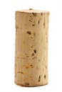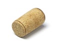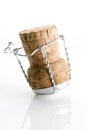 Close up view of the bottom of a wine bottle with a wine cork alongside a glass on a white background in a conceptual image