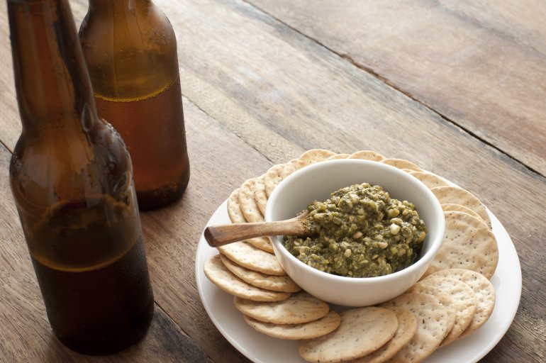 Beer next to plate of round cracker biscuits and dip on dark wooden table with copy space at top