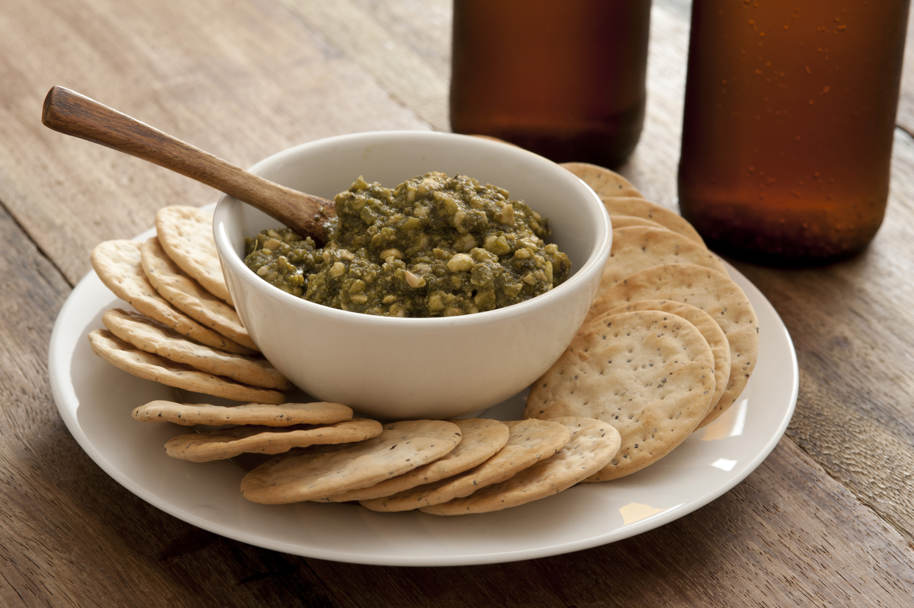 Plate full of dip and bowl of chips with two brown bottles of beer or other beverage over wooden table