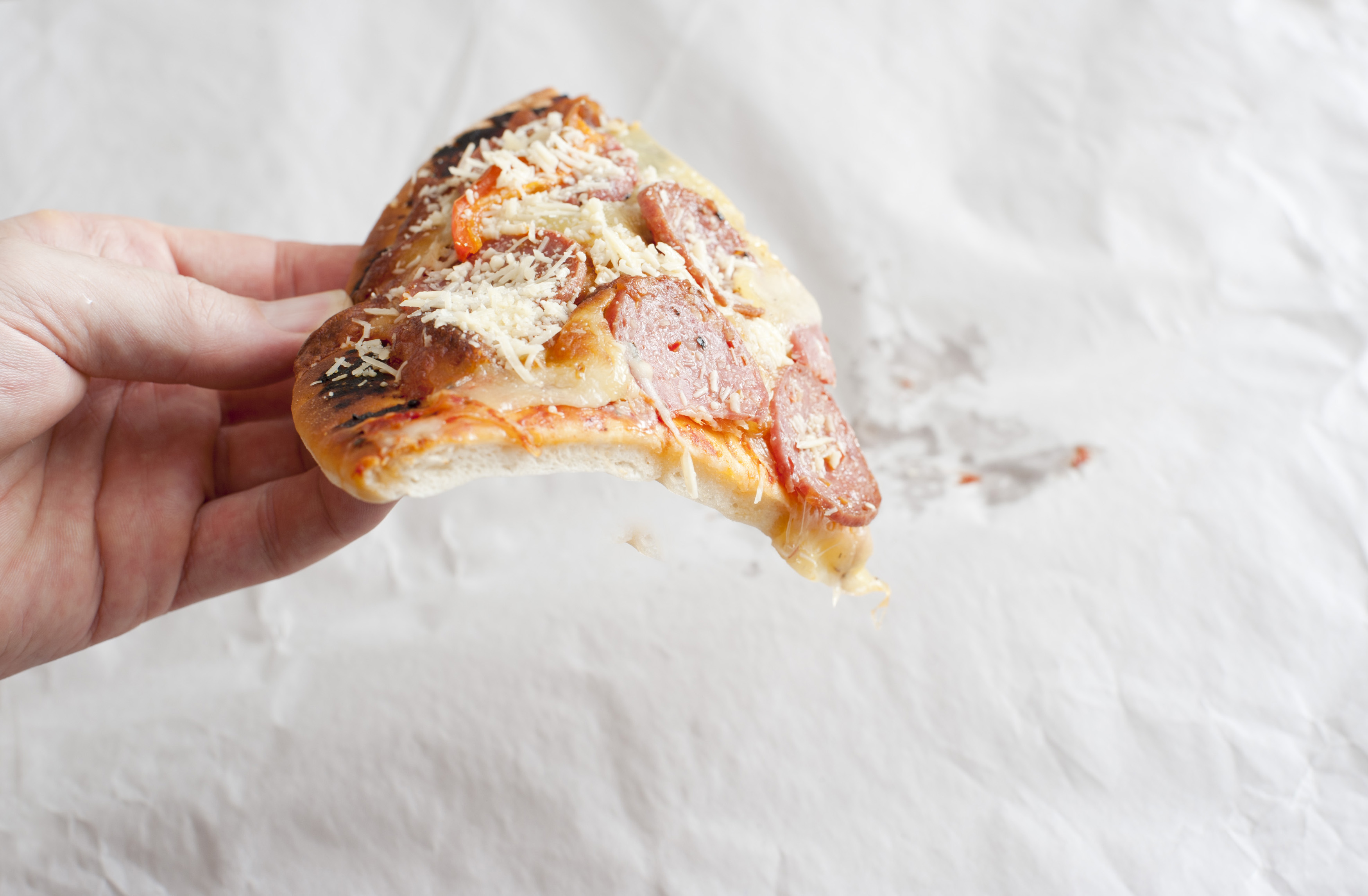 Hand of a man holding a single slice of traditional pepperoni salami Italian pizza over a crinkled sheet of white paper with copy space