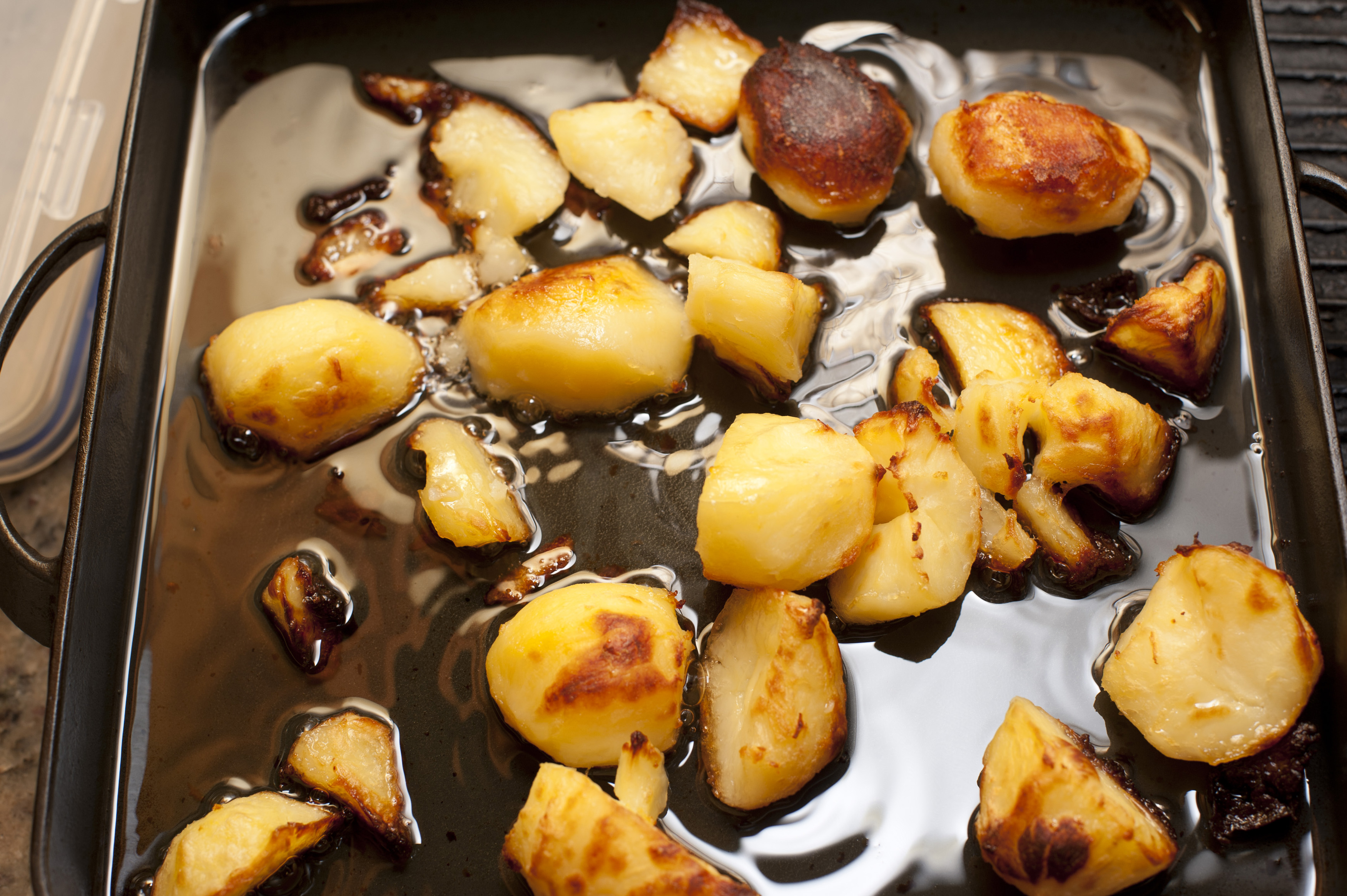 Crispy golden roast potatoes in an oily grill pan waiting to be served for dinner, close up high angle view