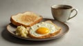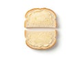 Single slice of buttered white bread ready to make a snack or sandwich on a white background with copyspace, overhead view