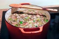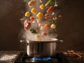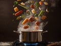 Clean fresh leeks boiling in a stainless steel saucepan with the water just coming to the boil, close up high angle view