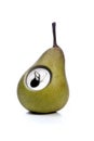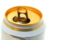 Opening canned vegetables with a manual steel can opener over a white background, close up view of an unlabelled can