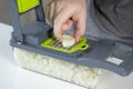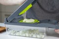 Left handed chef dicing onion on a kitchen counter preparing it for cooking , close up of the blade and his hands with copy space