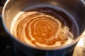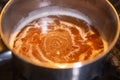 Making gravy with stock boiling in a stainless steel pot and a manual whisk for beating the mixture on thickening