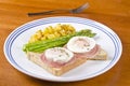 Two eggs being poached in boiling water on a gas range beside cuts of meat