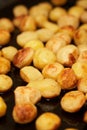 Metal container of golden crispy fresh roast potatoes on a buffet , close up high angle view