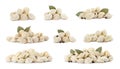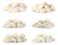 Uncooked dumplings sitting atop vegetable and meat stew in frying pan beside other kitchen items