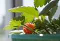 Closeup of juicy delicious fresh ripe red strawberries with stalk leaves attached on a colourful green background