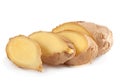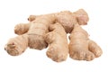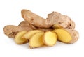 Fresh rhizomes of root ginger and a small container of the ground spice used as a flavouring in cooking