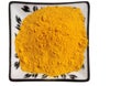 A spoon and a jar of ground turmeric in close-up on white background