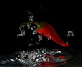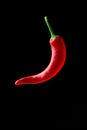 Two whole fresh red hot chili peppers, a pungent spice and flavouring used in cooking and salads