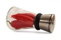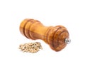 Milling black pepper with wooden mill. Close-up view against white surface background