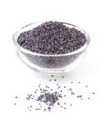 Pouring out poppy seeds from a glass bowl onto white table surface, viewed in close-up