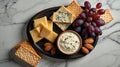 Plate full of dip and bowl of chips with two brown bottles of beer or other beverage over wooden table