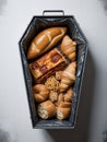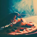 Hand holding greasy unappealing pepperoni pizza slice over white wrapping paper with grease stains and crumbs