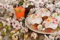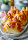Batch of delicious spicy hot cross buns with raisins served on a plate for an Easter snack symbolising the crucifixion of Christ