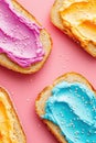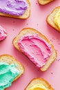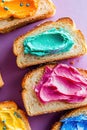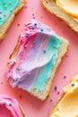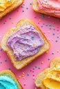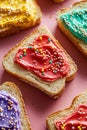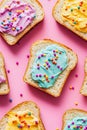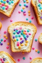 Buttered slice of white fairy bread covered in colorful sprinkles for a childhood treat for kids, overhead view on a white plate