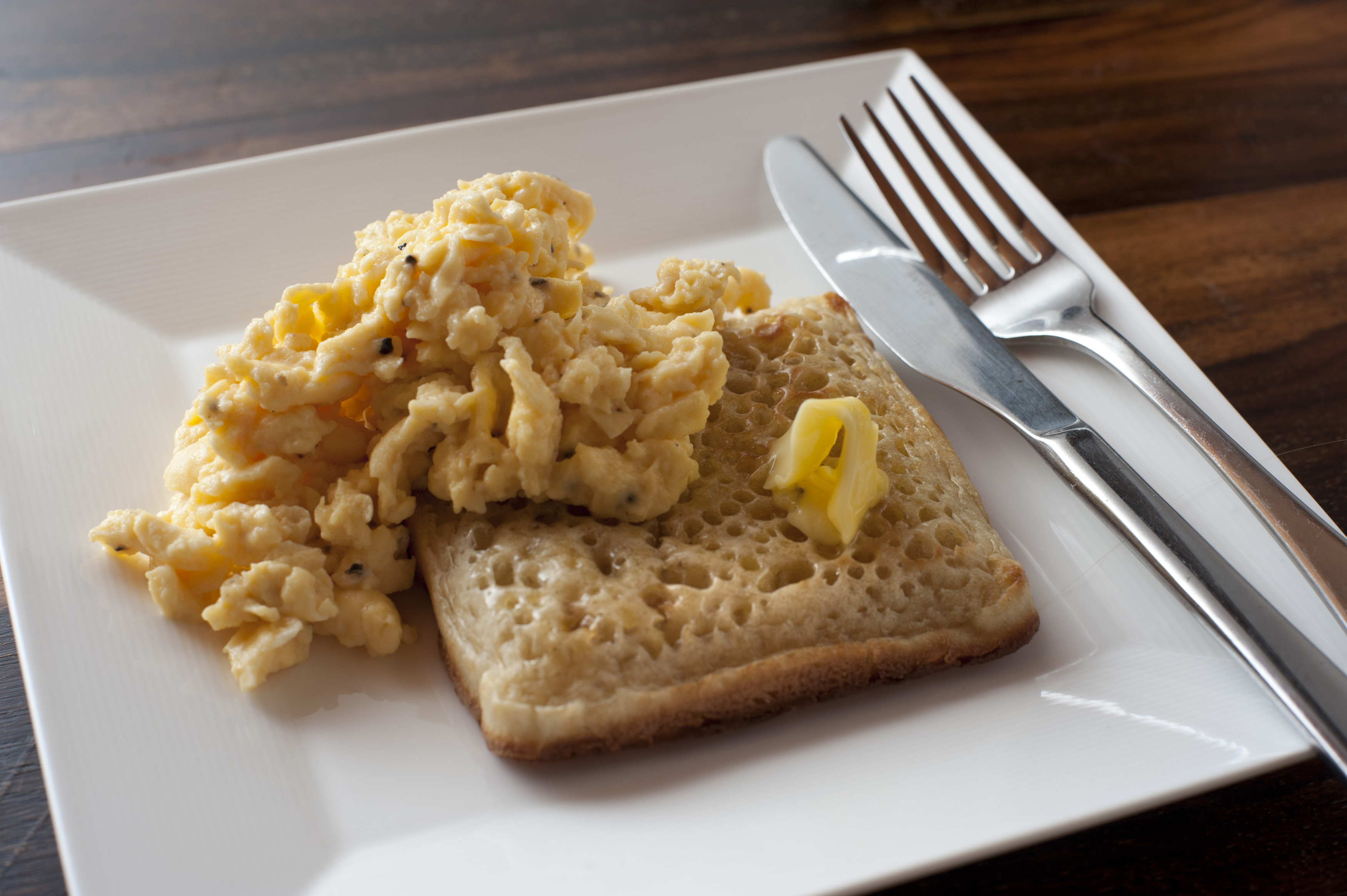 scrambled eggs with a crumpet by freefoodphotos.com is licensed under a Creative Commons Attribution 3.0 Unported License.