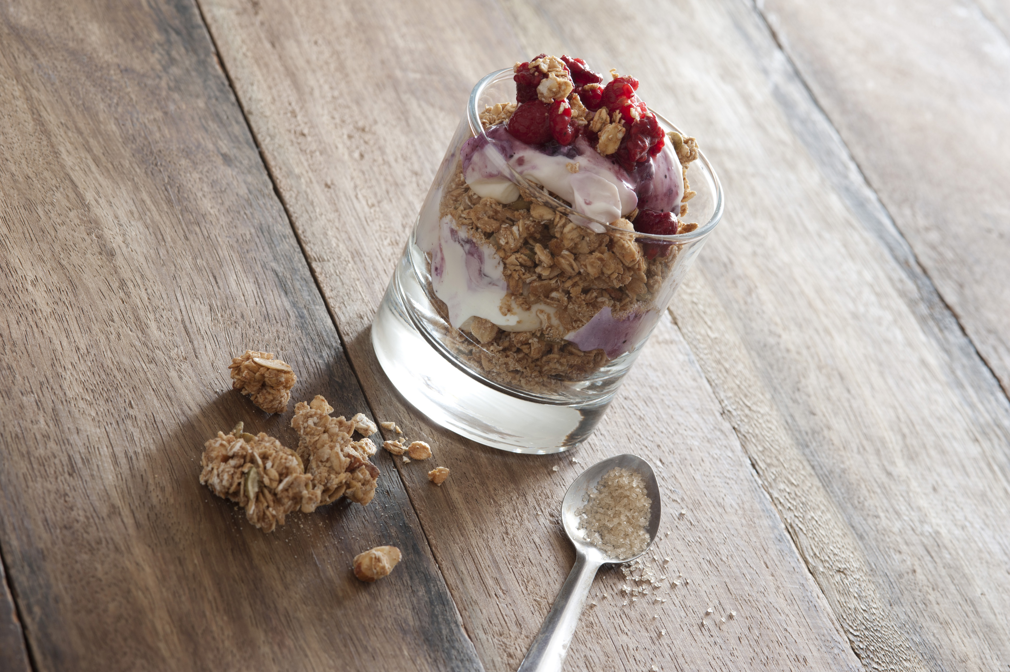 Crumbs and spoon beside cup of fruit topped granola and yogurt cereal over wooden paneled table