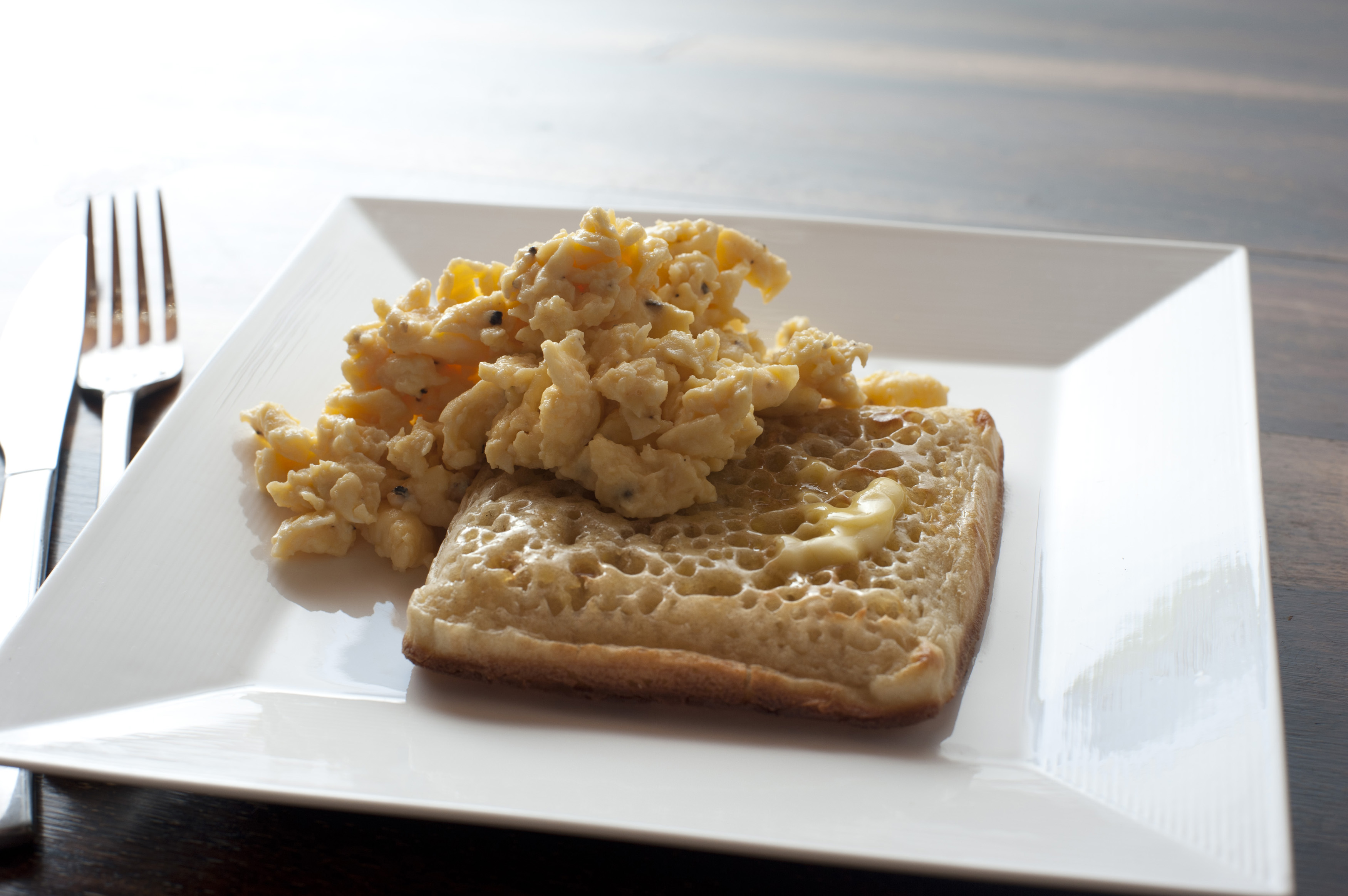 Single toasted crumpet and scrambled eggs by freefoodphotos.com is licensed under a Creative Commons Attribution 3.0 Unported License.