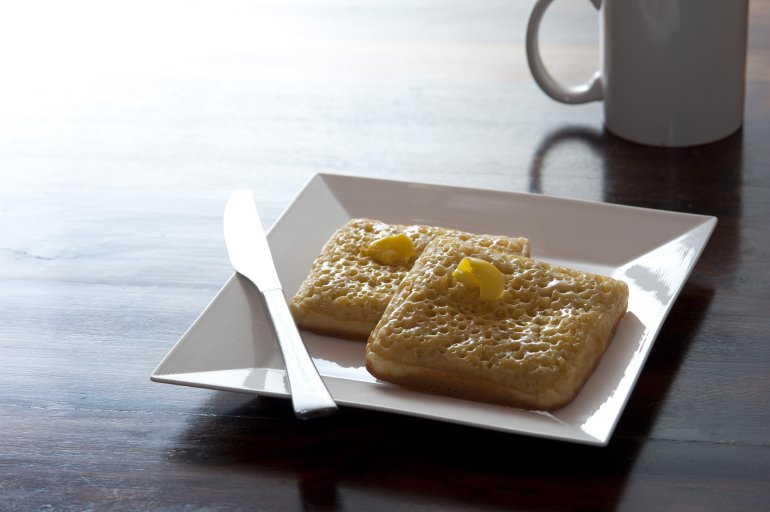 plate of crumpets on table by freefoodphotos.com is licensed under a Creative Commons Attribution 3.0 Unported License.