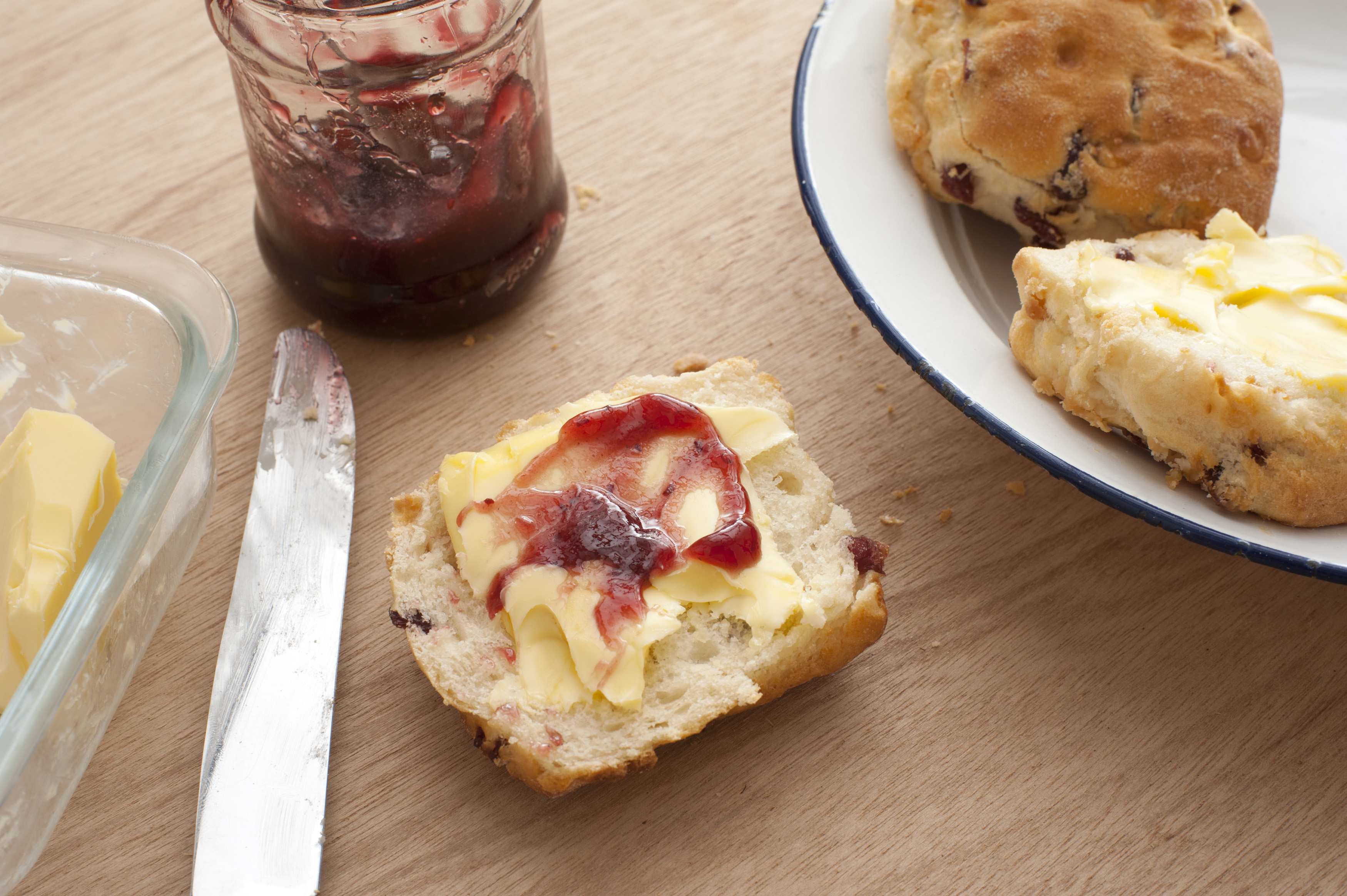 Buttered scone with strawberry jam by freefoodphotos.com is licensed under a Creative Commons Attribution 3.0 Unported License.