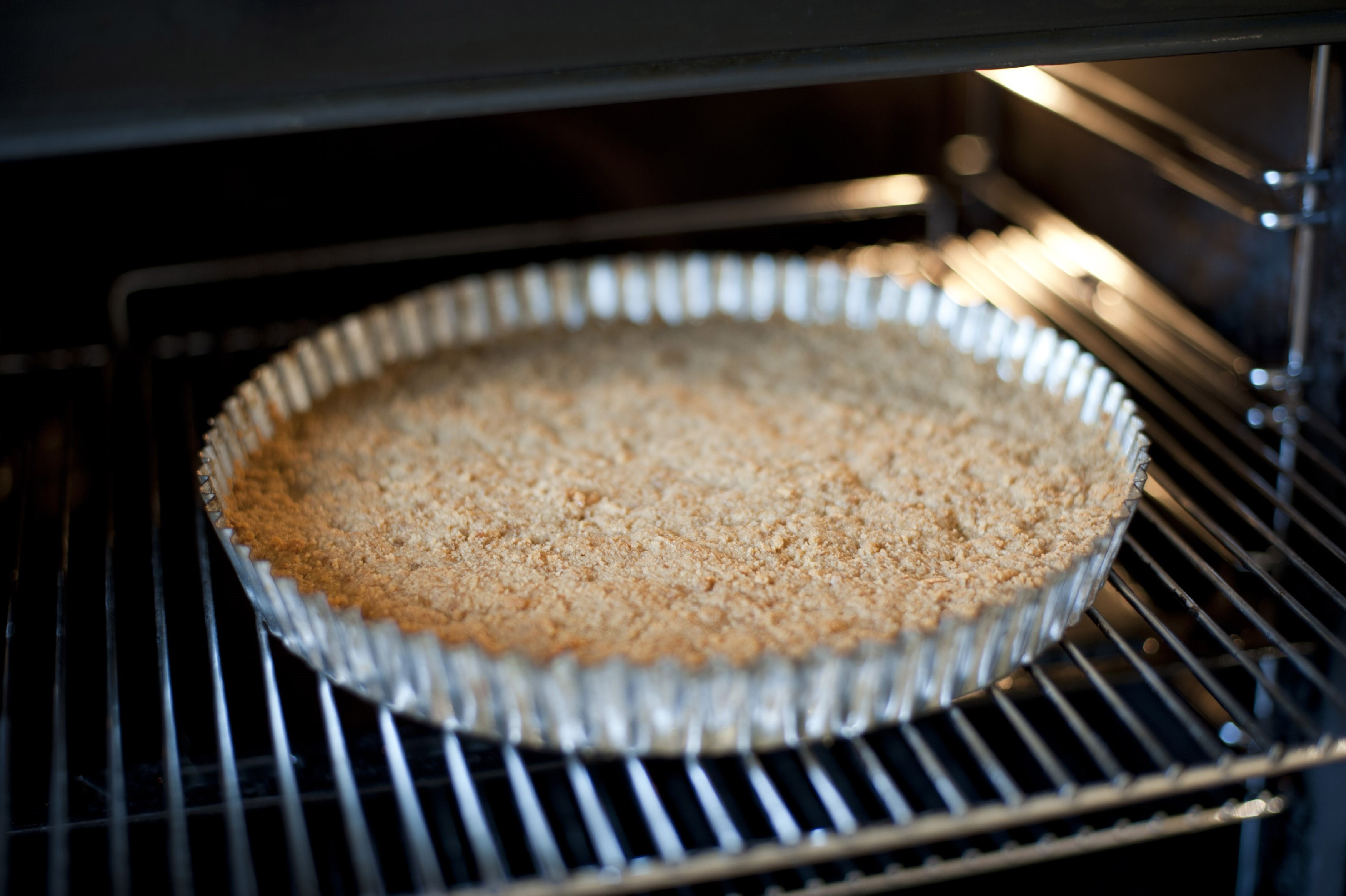 Cake base cooking in the oven in a decorative fluted round metal pie pan viewed under the interior light of the oven