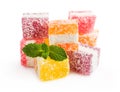 Colorful background of sugar coated jelly candy fruits arranged on a white background and viewed from above