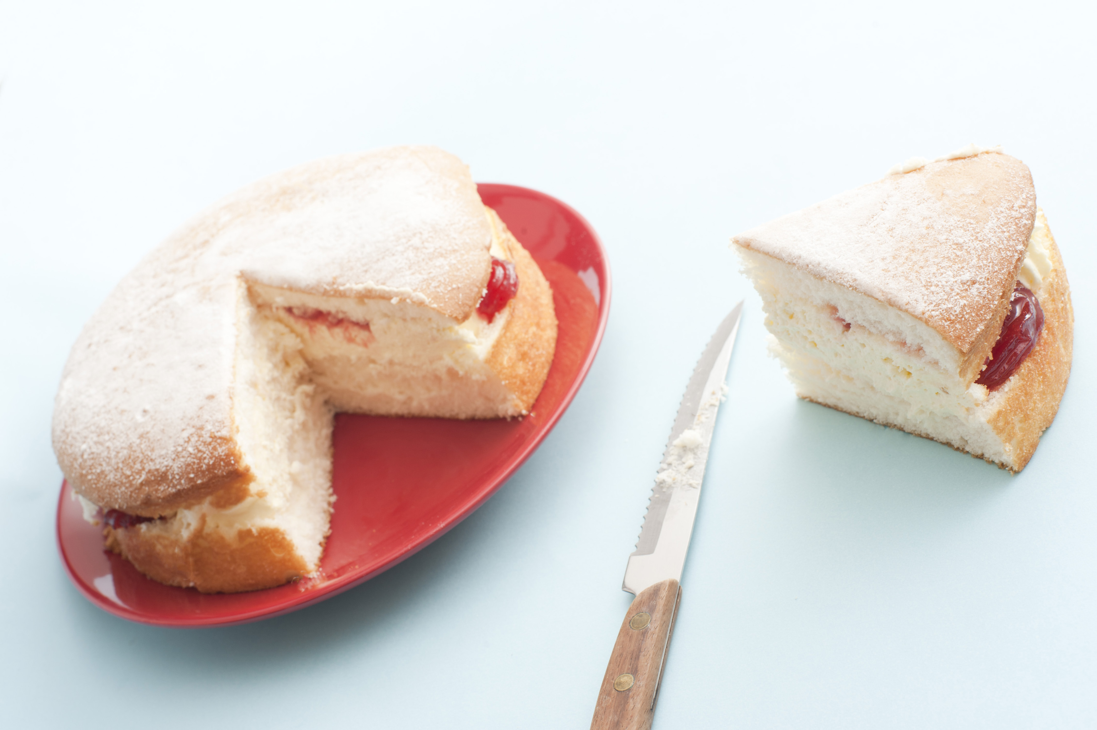 Freshly baked jam sponge cream cake with a generous slice on the side alongside a knife, served on a red plate