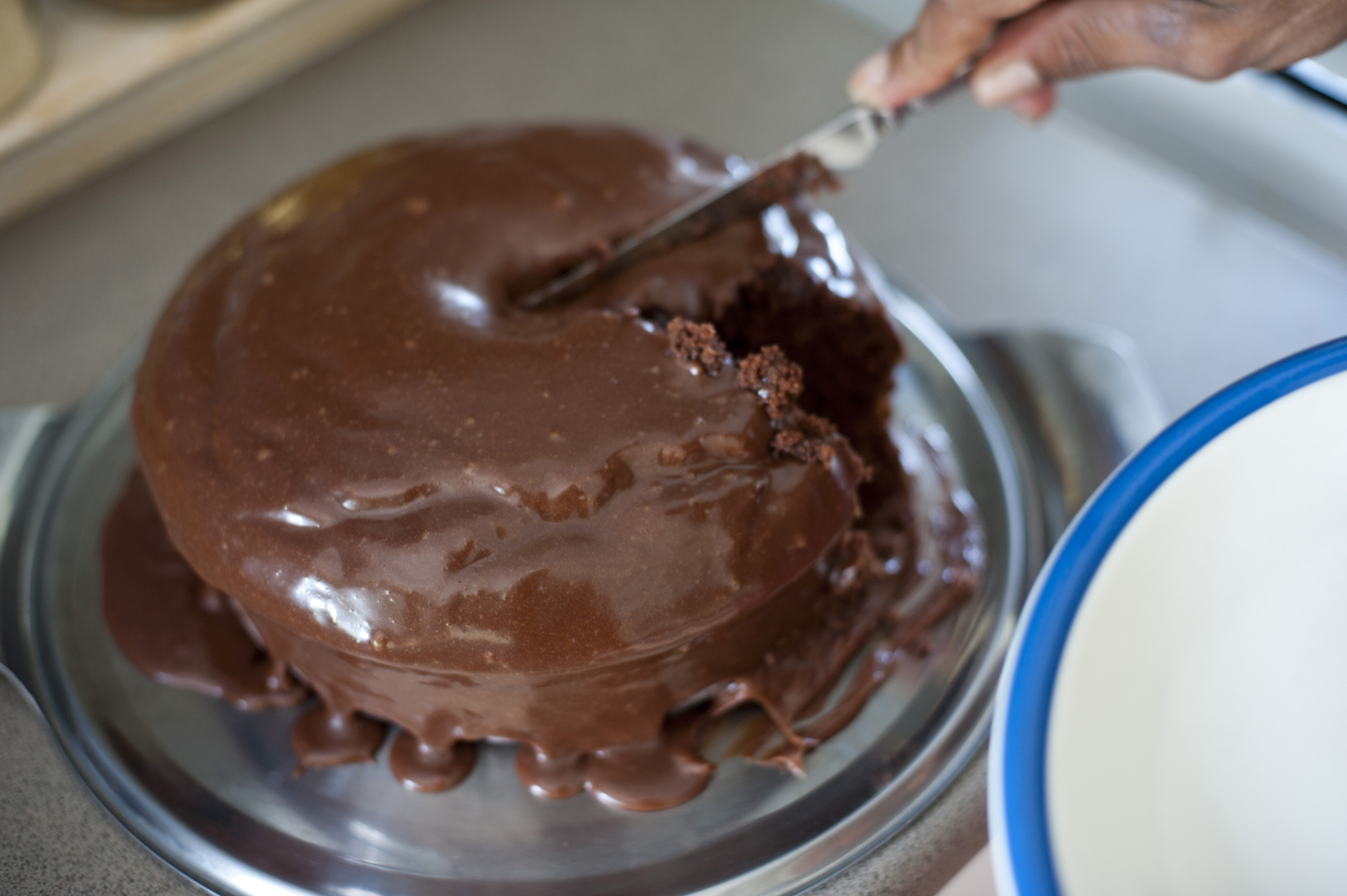 Person cutting a freshly baked mud cake or chocolate sponge dripping with chocolate icing serving a slice onto a side plate