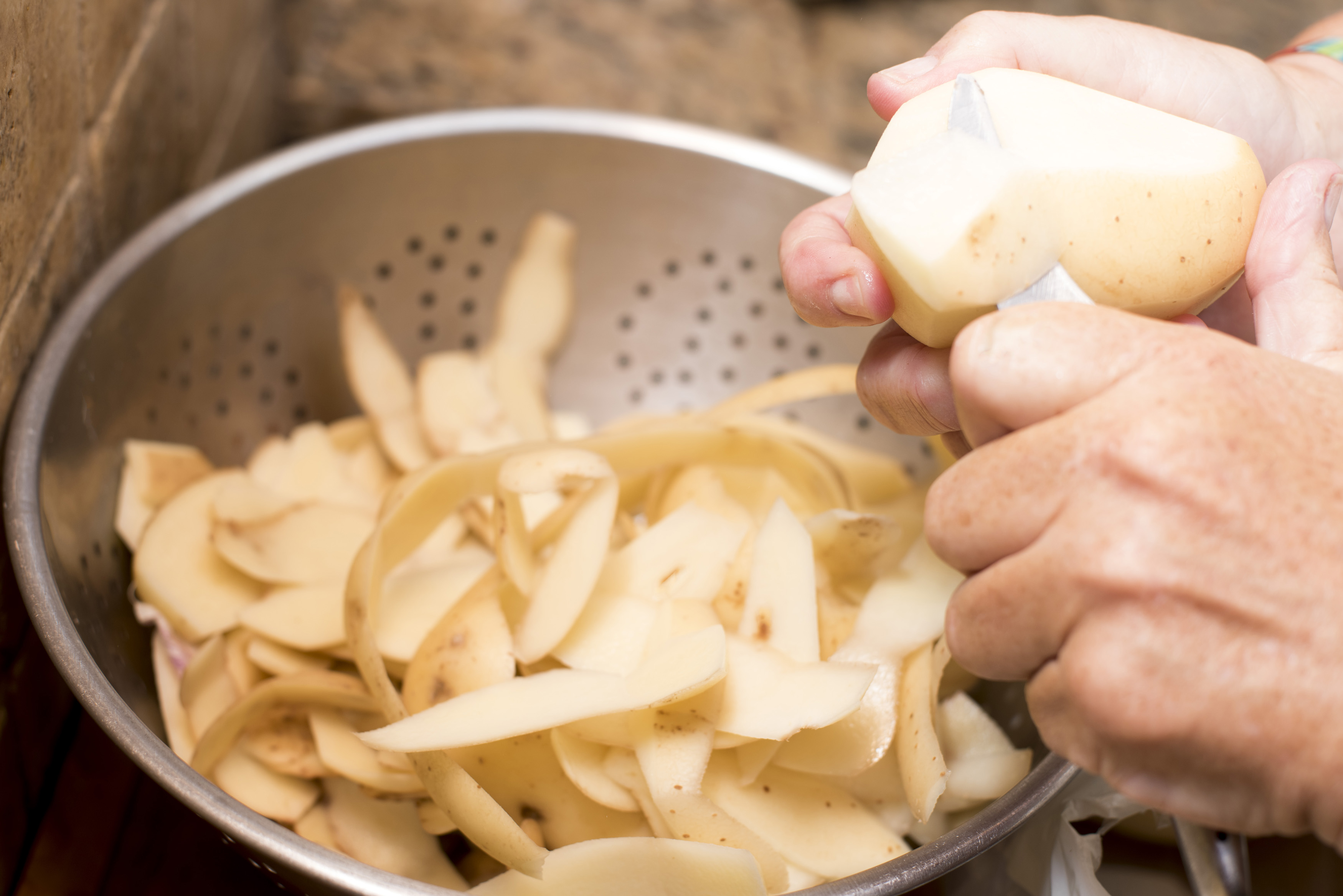 Man peeling fresh potatoes for cooking catching the peels in a metal colander, close up on his hands and the utensil