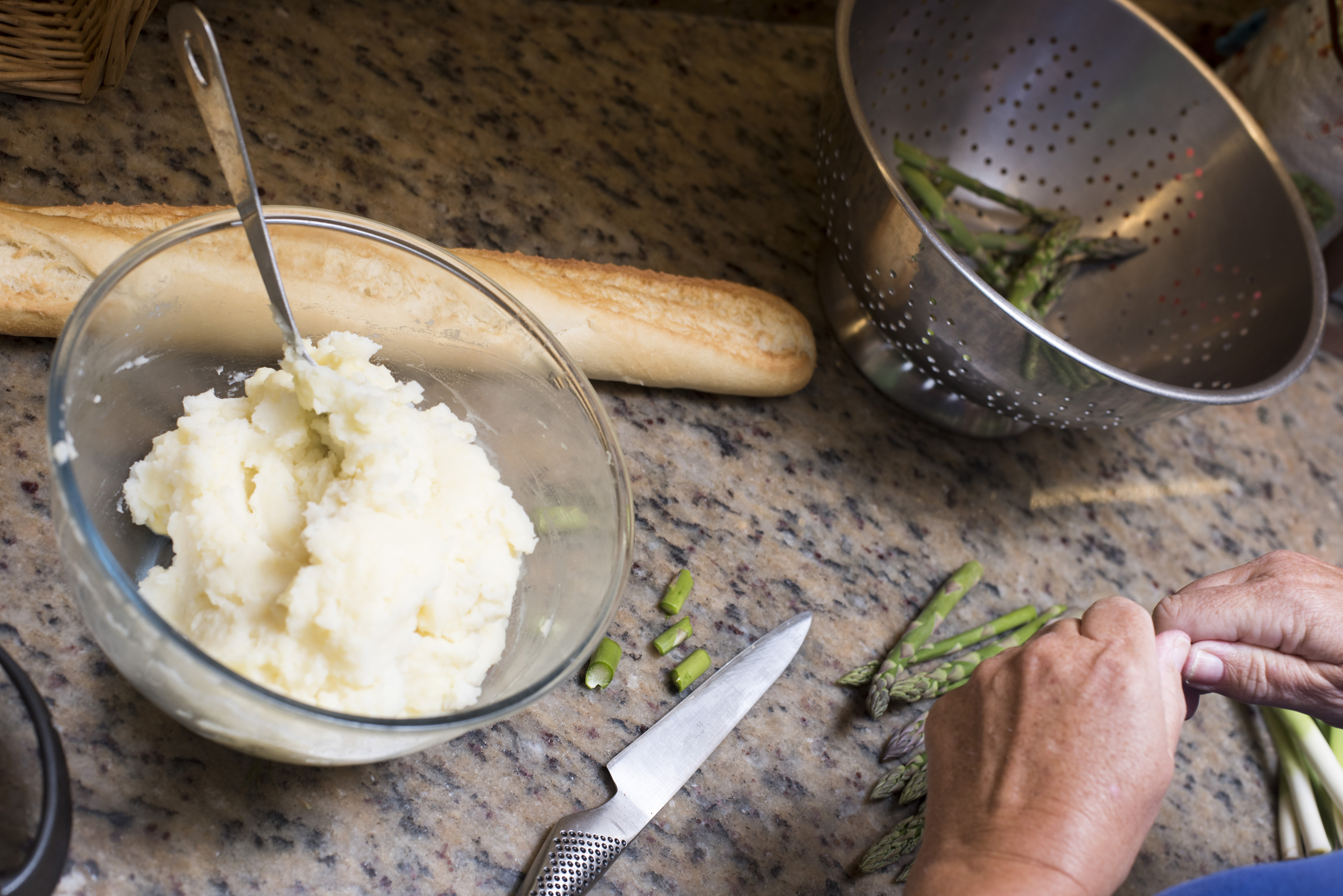 Man preparing the evening meal with mashed potato and green asparagus tips standing ready as he chops the leeks over a marble kitchen counter