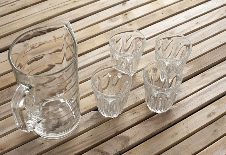 Clean empty transparent glass jug and four tumblers on a rustic slatted wooden table