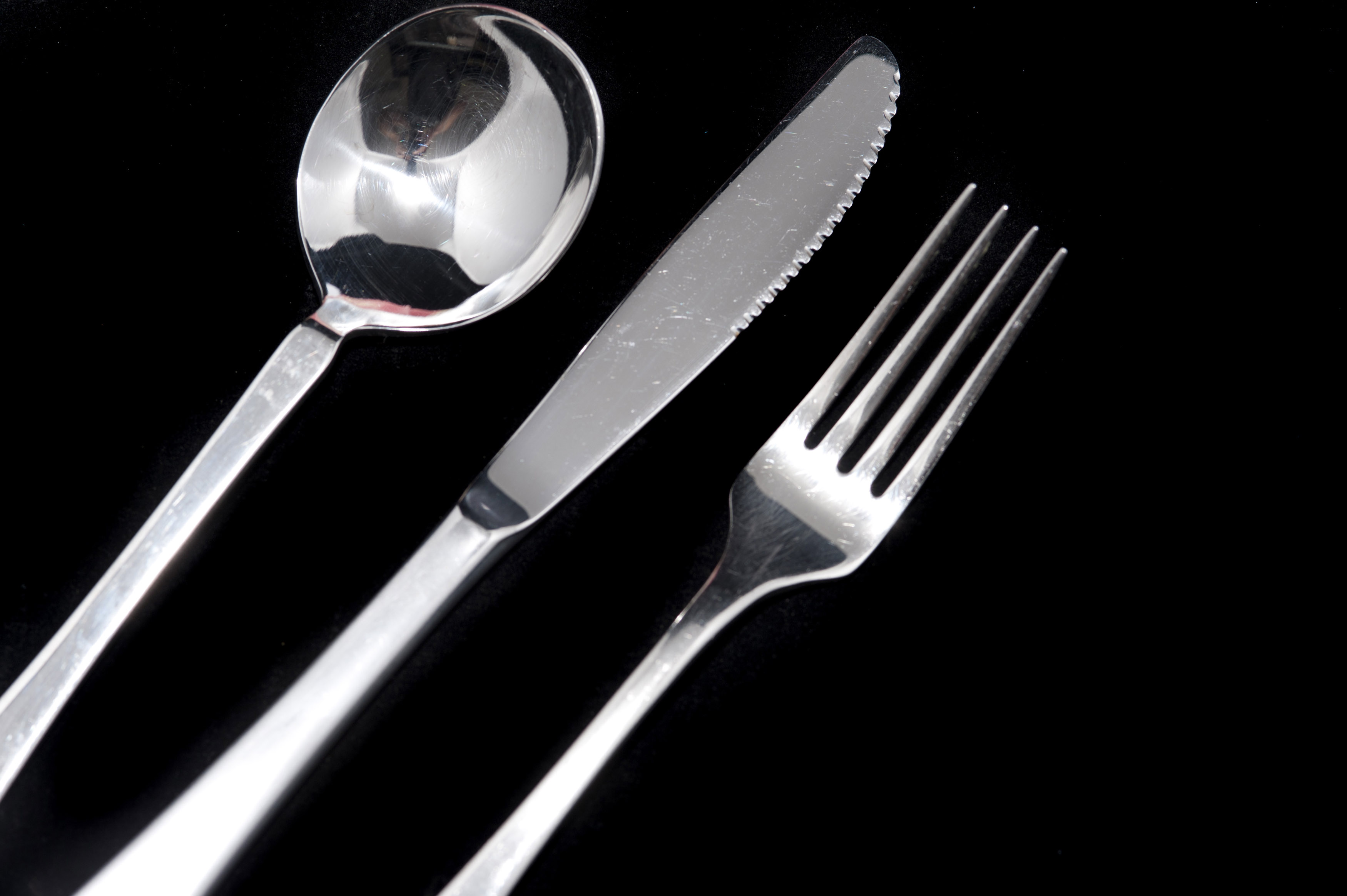 Clean metal knife, fork and spoon on black by freefoodphotos.com is licensed under a Creative Commons Attribution 3.0 Unported License.