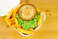 Pub lunch with the traditional meat pie and potato chips with dipping sauce served on a plate