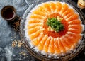 Raw salmon sashimi with soy sauce and a side dish of rice served with Asian chopsticks in individual bowls