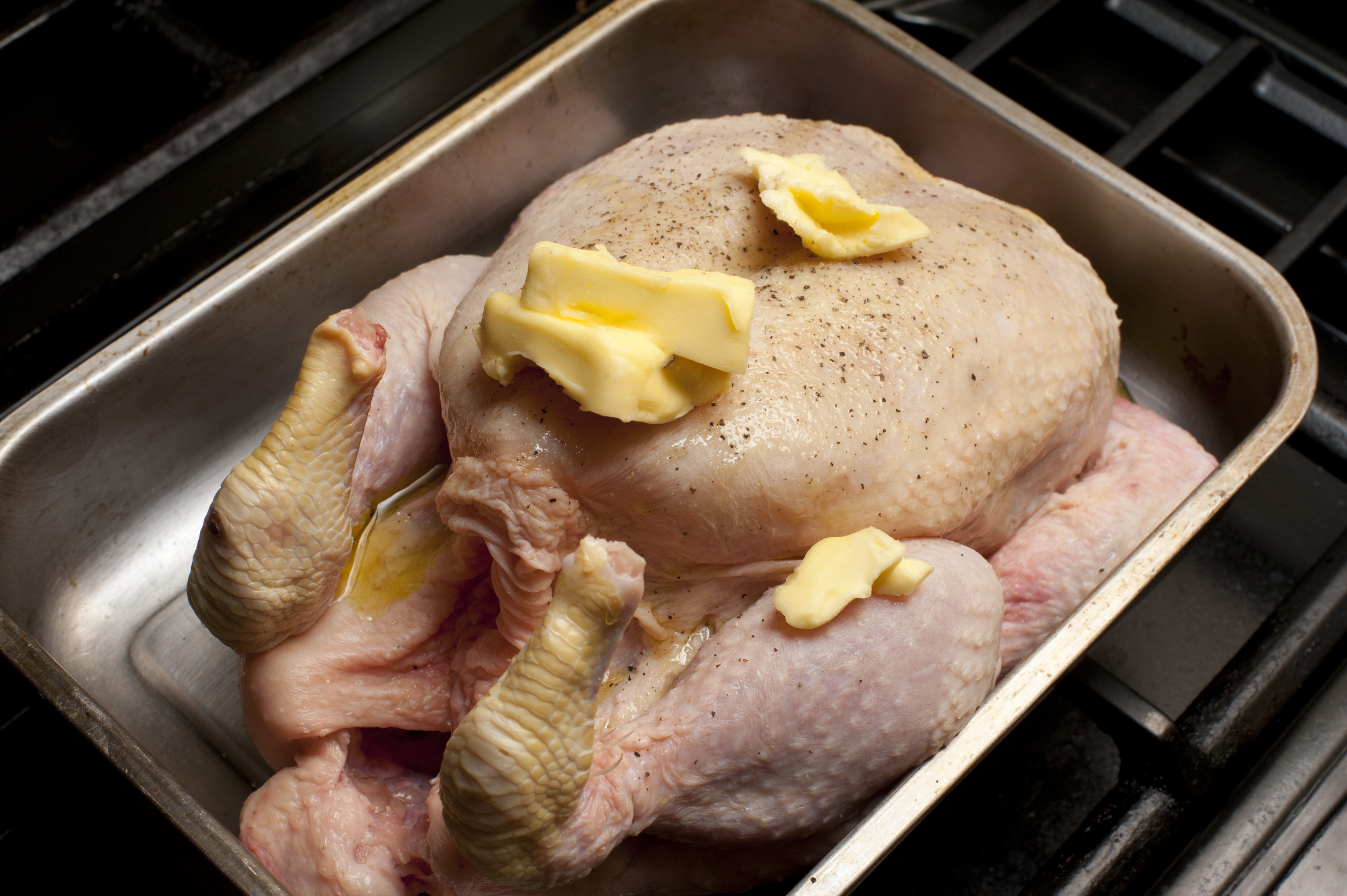 Fresh whole raw chicken seasoned with spices and daubed with butter standing in an oven roasting pan ready for roasting