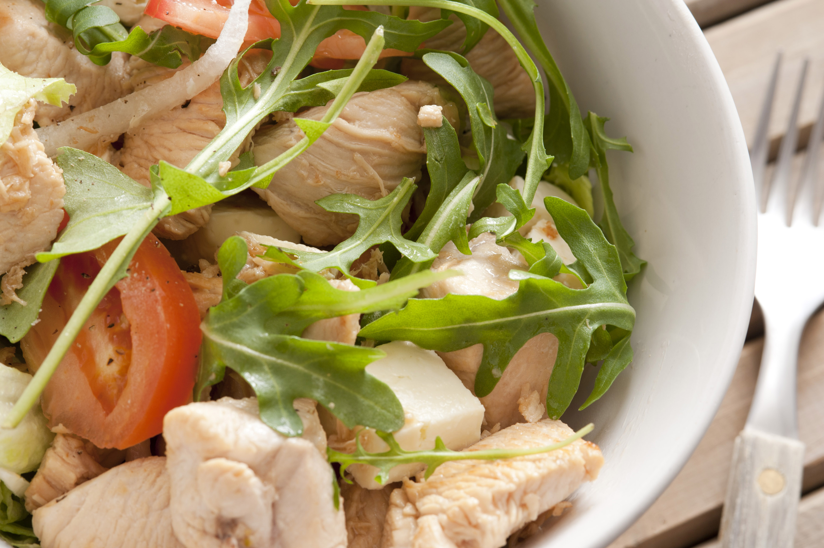 Close up of healthy chicken salad dish with rocket