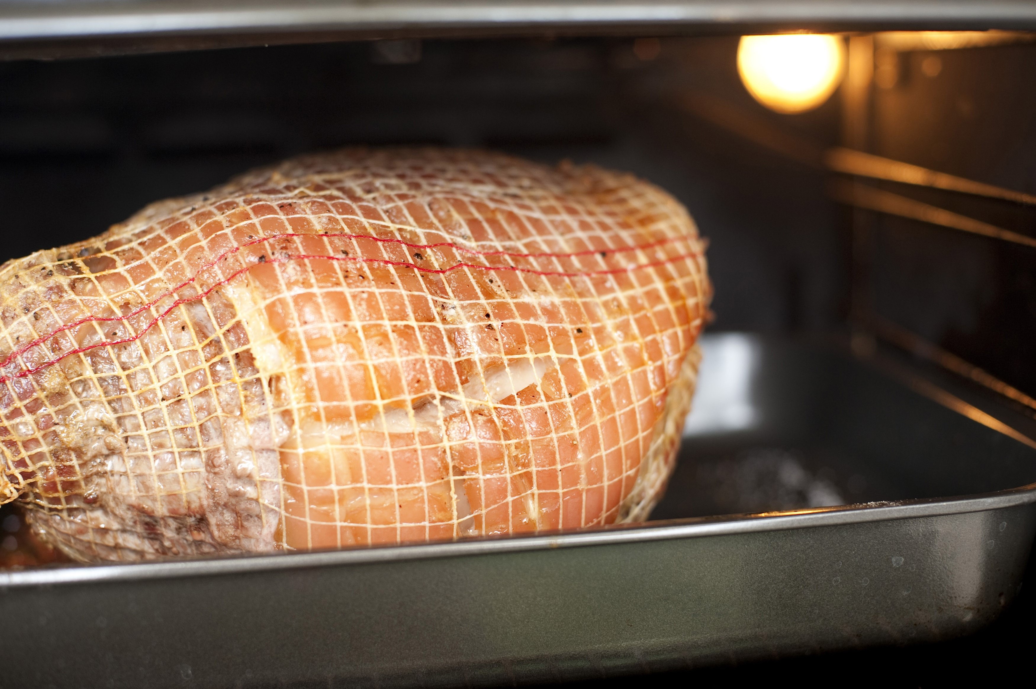 Interior view of a cut of pork roasting in the oven bound in net on a grilling pan
